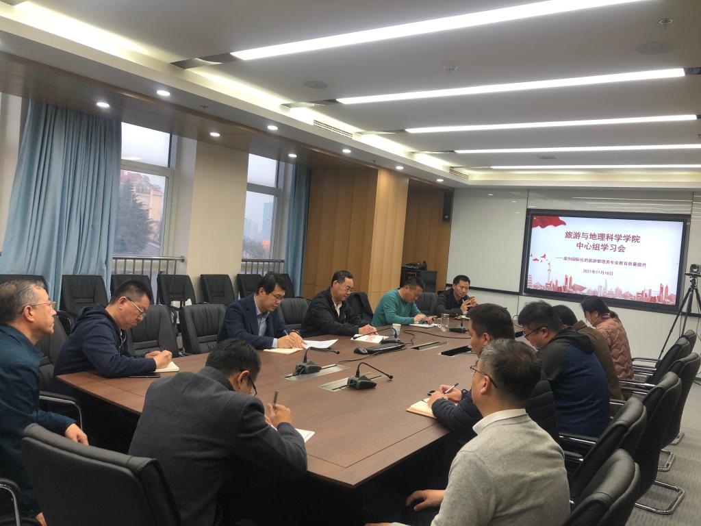 11月18日下午,旅游与地理科学学院党委理论学习中心组在双子楼A座509举行题为《面向国际化的旅游管理类专业教育质量提升》的中心组学习会,校党委常委、副校长李军参加了现场学习。会上,大家集体学习了党的十九届六中全会的会议精神,并结合学院的办学实际,根据各自的学习心得依次交流发言。