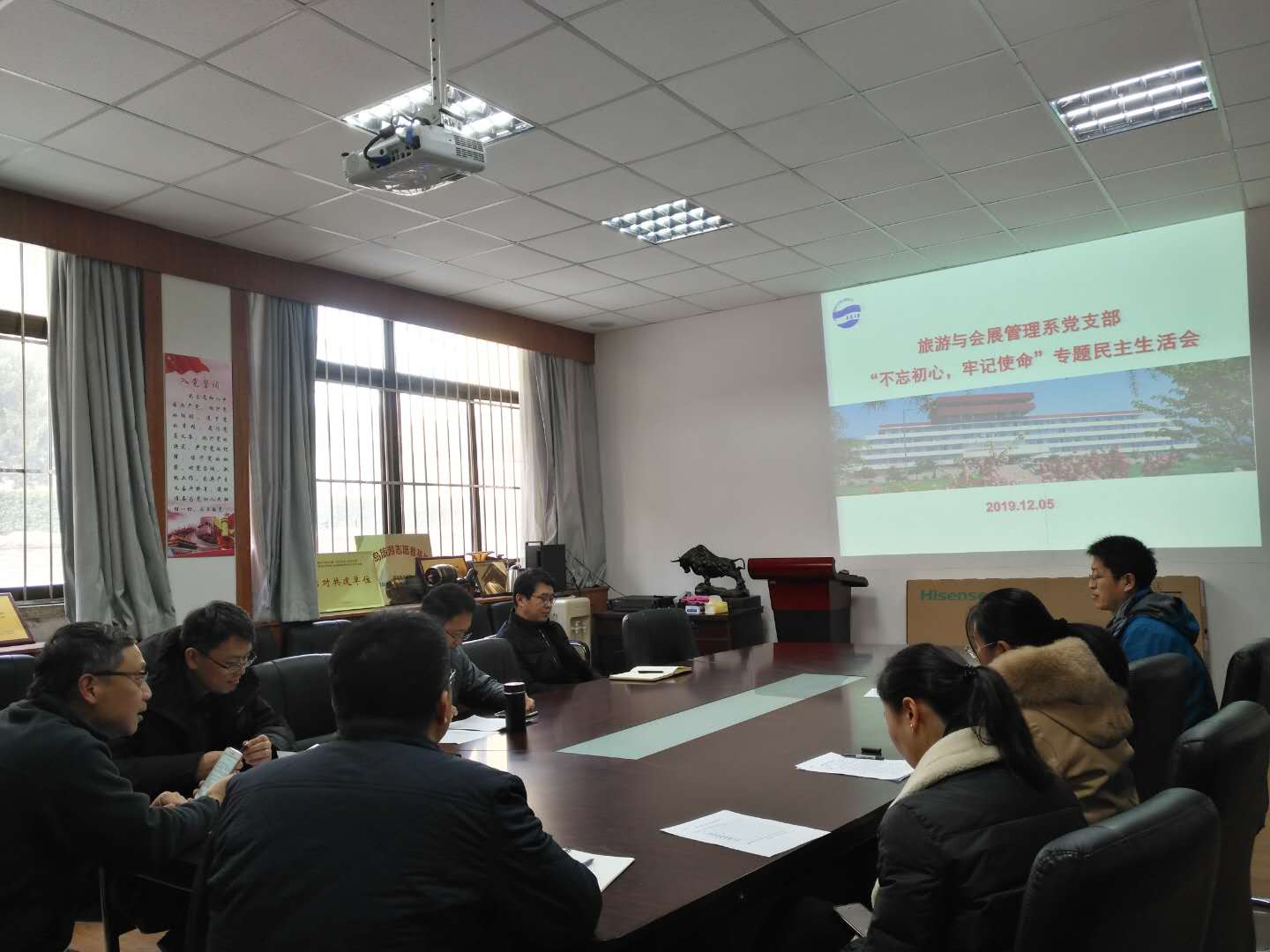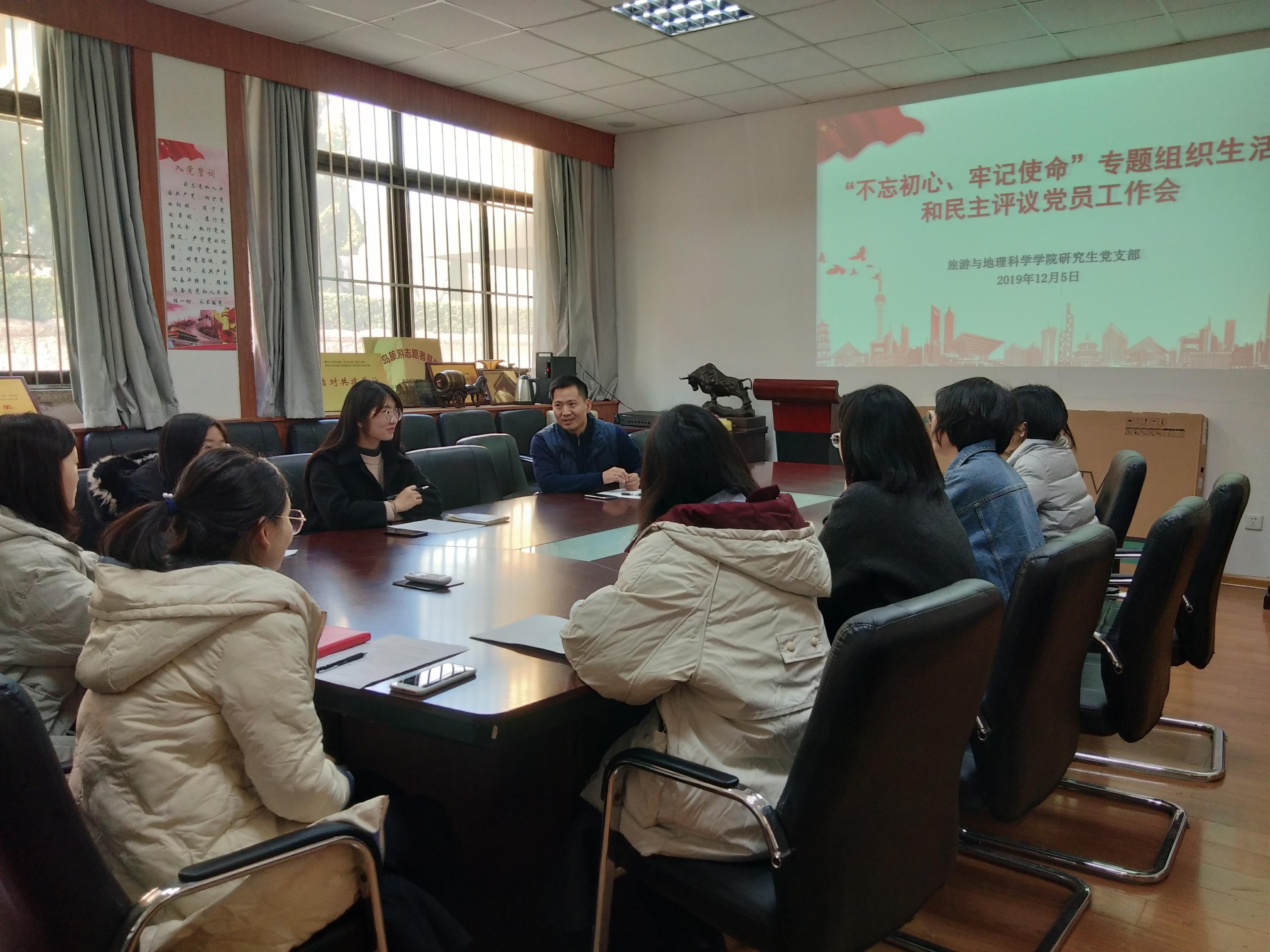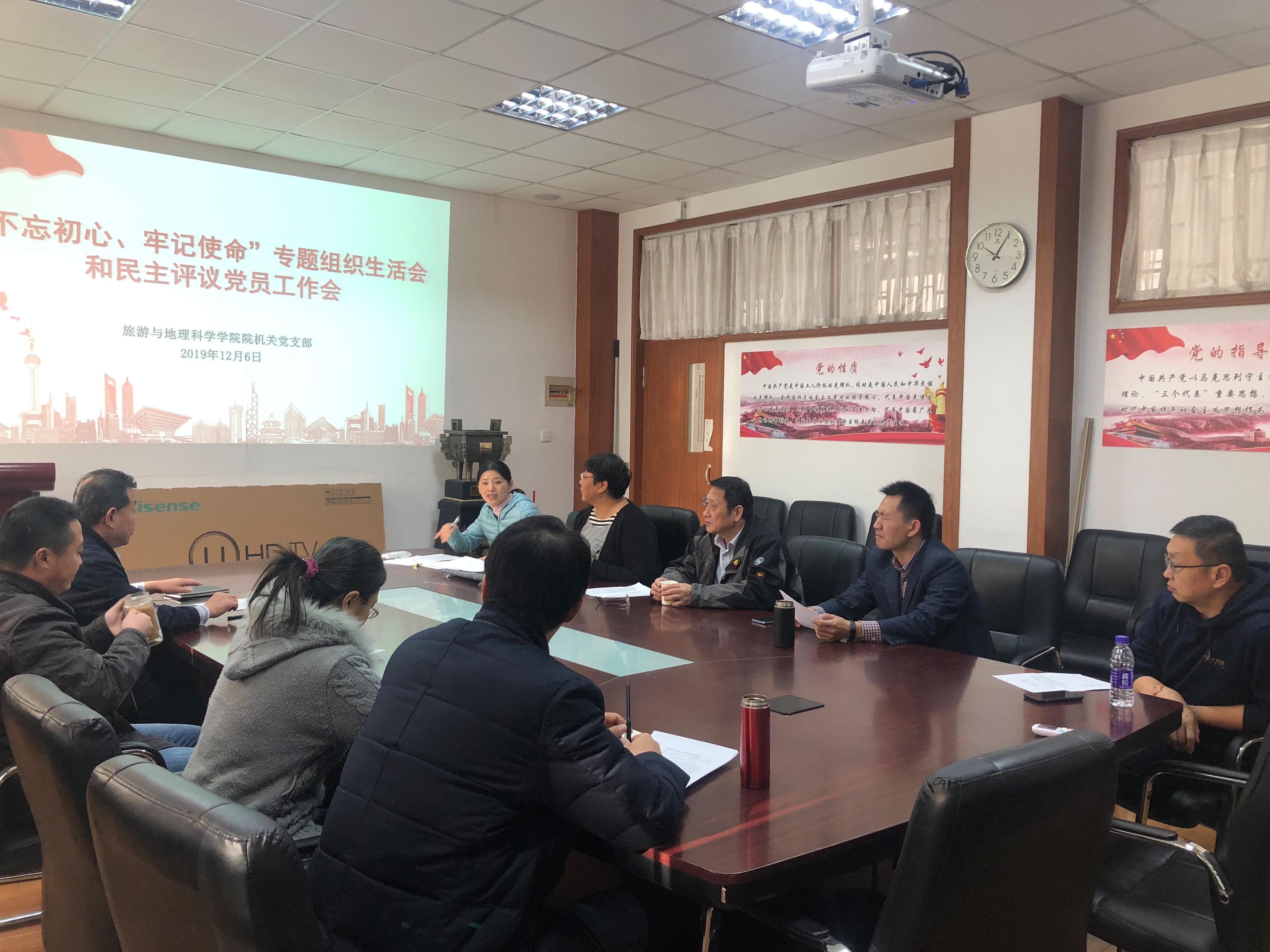2019年12月5日----7日,旅游与地理科学学院各党支部分别召开2019年度“不忘初心、牢记使命”专题组织生活会和民主评议党员会,院党委成员刘善东、肖建红、耿庆汇、张言庆分别参加了6个支部的组织生活会,各党支部全体党员参会。