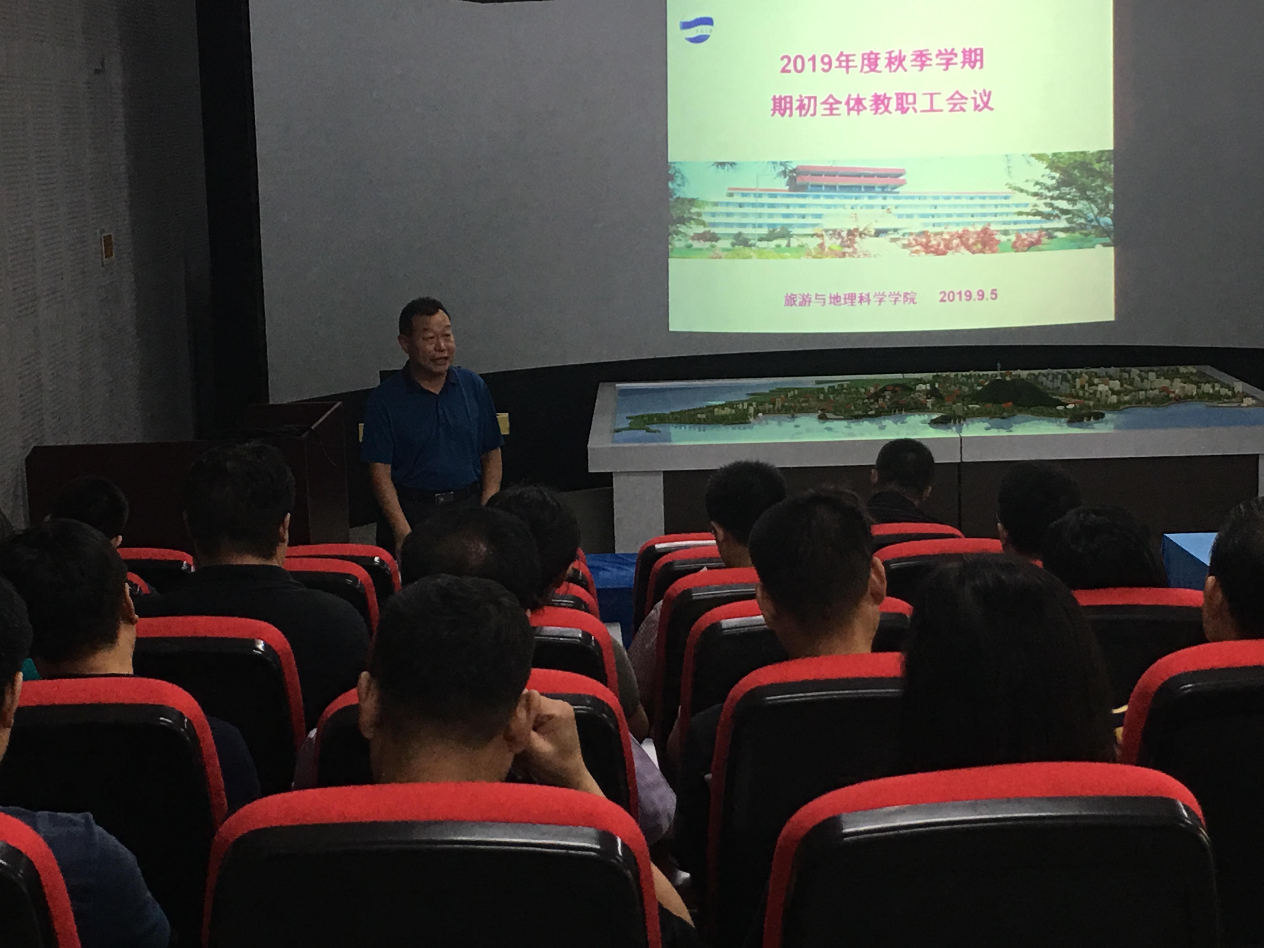 9月5日下午,旅游与地理科学学院在数字旅游实验室召开全院教职工大会,传达学习学校党委全委(扩大)会议暨2019年暑期中层干部学习研讨班的会议精神,总结2019年上半年学院工作,部署下半年任务安排。学院全体教职工参加会议。