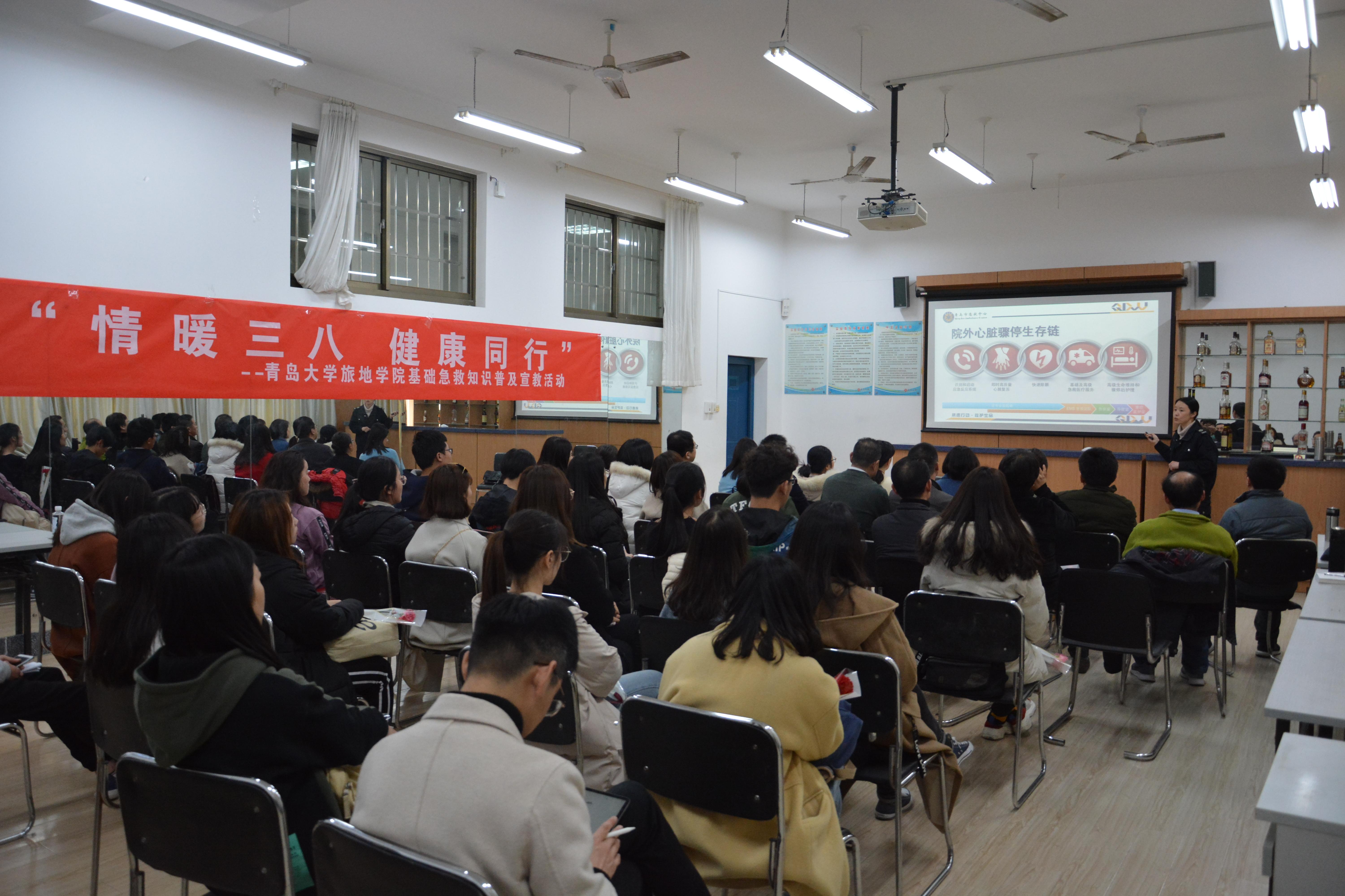 3月7日,旅游与地理科学学院于万象城awc体育浮山校区静思楼酒店管理实验室举办“情暖三八,健康同行”基础急救知识普及宣教活动,青岛市急救中心培训科讲师李斌女士受邀参加并做基础急救知识宣讲,学院党政领导、全体教师及同学代表参加本次活动。