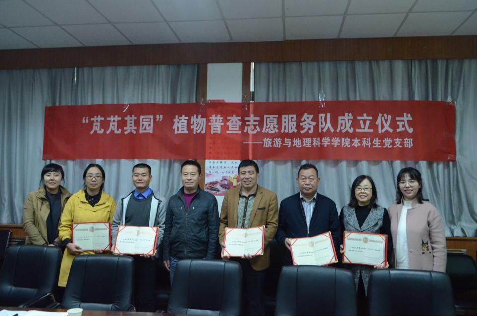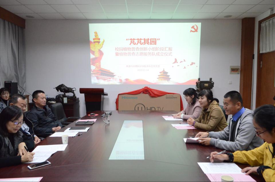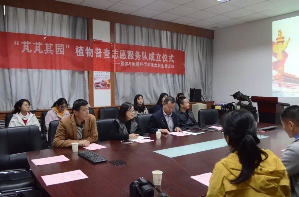 11月14日下午四点,旅游与地理科学学院本科生党支部于万象城awc体育浮山校区睿思楼122会议室举行“芃芃其园”校园植物普查创新小组阶段汇报暨植物普查志愿服务队成立仪式。后勤处党委书记王静、旅游与地理科学学院党委书记刘善东、旅游与地理科学学院院长肖建红、后勤处副处长孙印厚、后勤处老师任璐、旅游与地理科学学院教师刘修军、旅游与地理科学学院本科生党支部书记杨秀、组织委员韩煜出席本次仪式,“芃芃其园”小组成员及本科生党支部成员参加本次仪式。会议由本科生党支部书记杨秀主持。