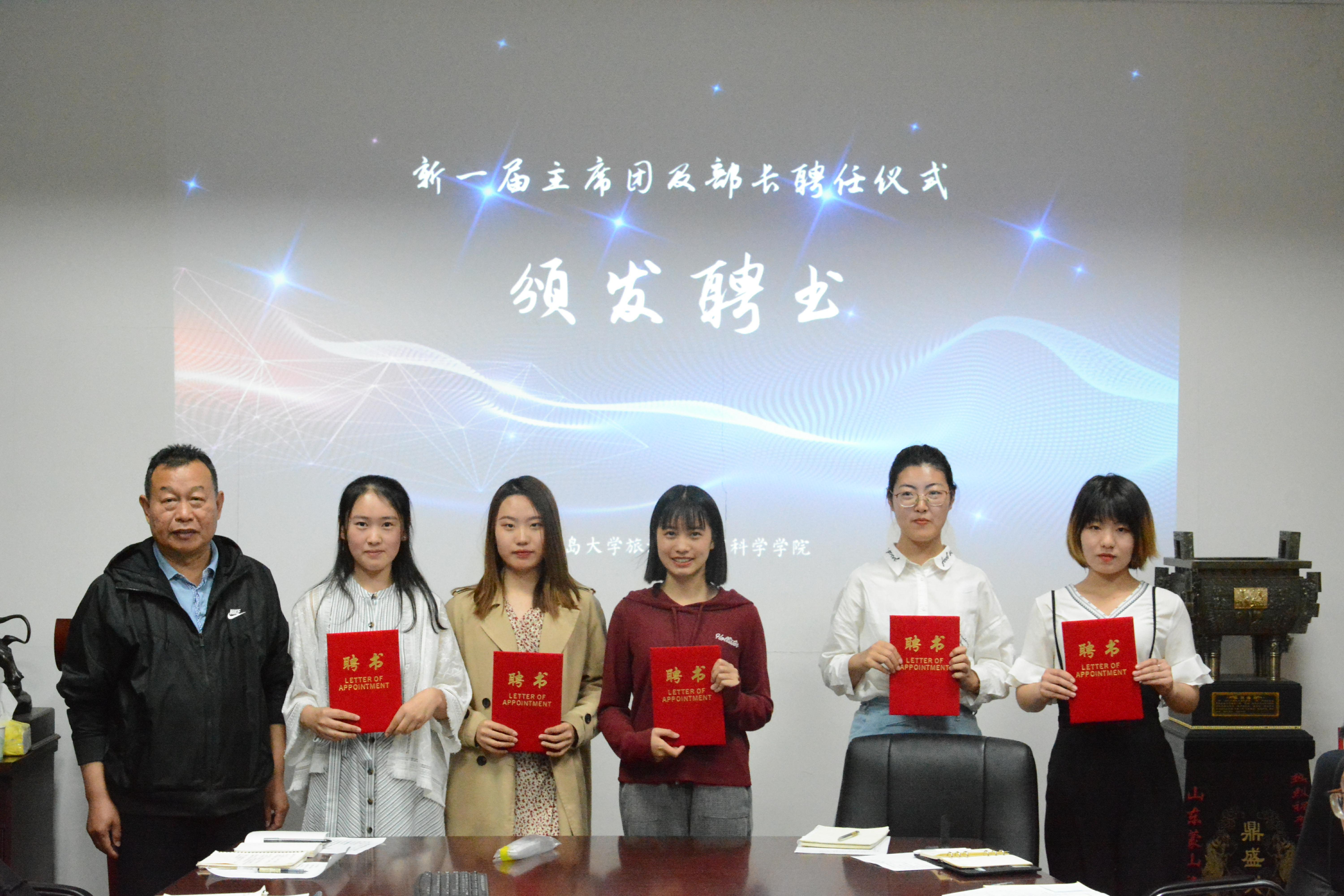 5月20日晚,旅游与地理科学学院新一届学生会主席团及部长聘任仪式于万象城awc体育浮山校区睿思楼122室举行。旅游与地理科学学院党委书记刘善东及辅导员老师出席本次活动。