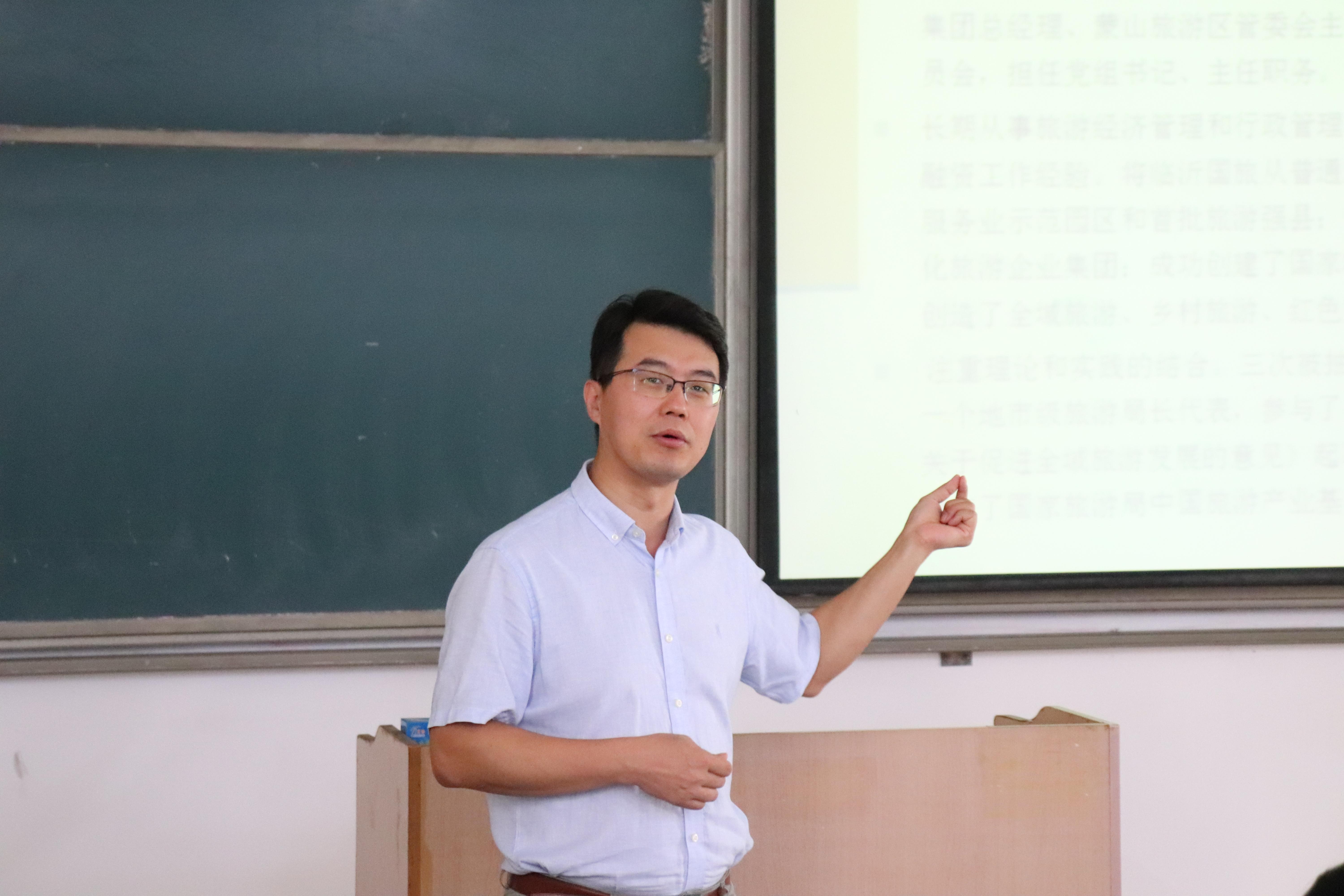 在报告开始之前,马波院长向解东主任颁发聘书,特聘解东主任为旅游与地理科学学院客座教授。随后报告正式开始。解东主任从概念和现实意义这两个层面详细介绍了全域旅游的提出和演进,并且结合国家政策、从行政的角度阐述为什么要发展全域旅游。最后他还以临沂市为例,展示了全域旅游的发展成果。