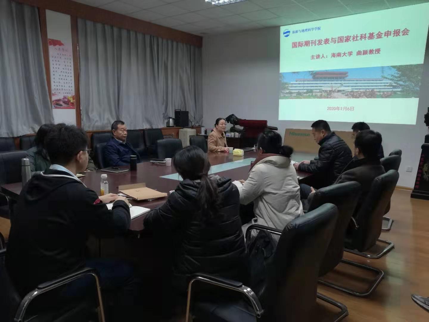 2020年1月6日上午9点,旅游与地理科学学院在睿思楼122会议室举办了国际期刊发表与国家社科基金申报会。学院邀请海南大学曲颖教授来我院做学术交流报告,我院老师和部分研究生参加了会议,院长肖建红教授主持交流会。