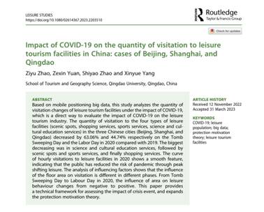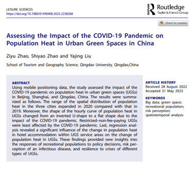近日,学院赵梓渝教授及其研究团队在SSCI期刊《Leisure Sciences》发表高水平论文《Assessing the Impact of the COVID-19 Pandemicon Population Heat in Urban Green Spaces inChina》;在《Leisure Studies》发表高水平论文《Impact of COVID-19 on the quantity of visitation to leisure tourism facilities in China: cases of Beijing, Shanghai, and Qingdao》。赵梓渝教授是论文的第一作者和通讯作者,万象城awc体育旅游与地理科学学院为论文的唯一署名单位。该研究得到国家自然科学基金青年项目、教育部人文社科青年基金项目、山东省自然科学基金青年项目资助。