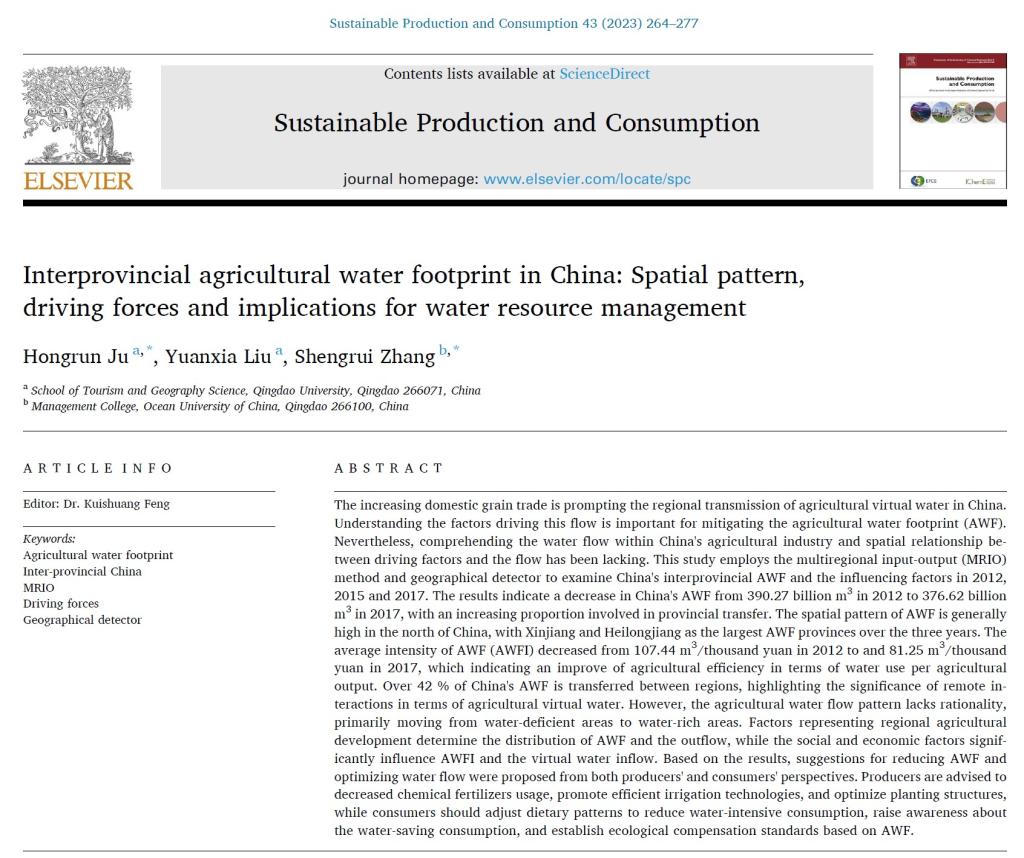 近日,学院鞠洪润副教授及其研究团队在《Sustainable Production and Consumption》(SSCI Q1,IF=12.1)发表题为“Interprovincial agricultural water footprint in China: Spatial pattern, driving forces and implications for water resource management”的研究论文。万象城awc体育为论文第一署名单位,鞠洪润副教授为论文第一作者。该研究得到国家自然科学基金(42201311,42001243)、教育部人文社会科学基金(22YJCZH071,20YJC630212)等项目的资助。