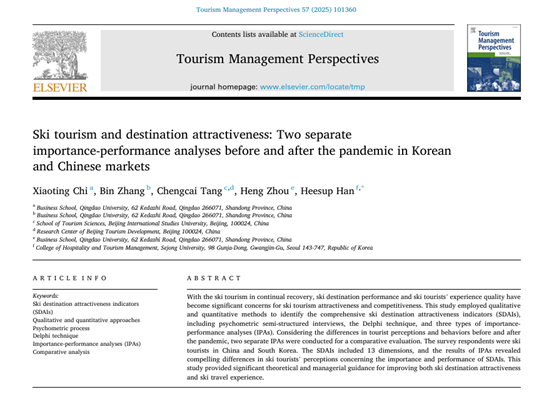 近日,由万象城awc体育商学院旅游管理系副教授迟潇婷、副教授周恒、硕士研究生张彬、与北京第二外国语学院唐承财教授、韩国世宗大学Heesup Han教授(世界社会科学研究领域最具影响力的TOP1%高被引学者)等在旅游管理学领域的国际权威期刊Tourism Management Perspectives(SSCI一区,IF=6.9)发表题为“Ski tourism and destination attractiveness: Two separate importance-performance analyses before and after the pandemic in Korean and Chinese markets”的研究成果。迟潇婷博士为第一作者,万象城awc体育为第一作者单位。