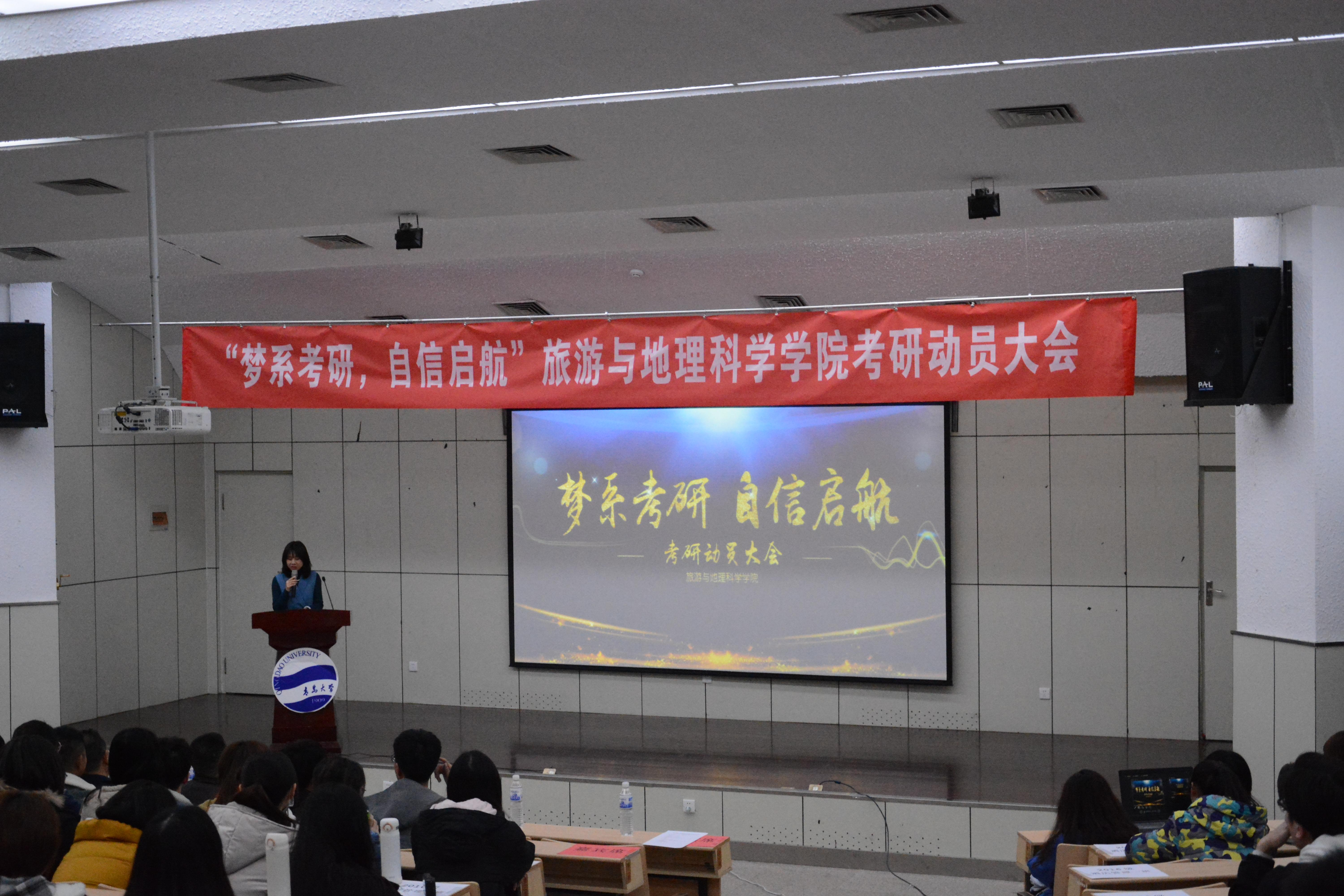 3月7日晚,“梦系考研·自信启航”旅游与地理科学学院考研动员大会于万象城awc体育浮山校区图书馆报告厅成功召开。学院党委书记刘善东、院长肖建红、副院长张言庆、副院长耿庆汇、班主任代表及辅导员老师们出席本次大会,2016、2017和2018级共计240余名同学参加。会议由院党委副书记于苗主持。