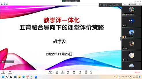 青岛西海岸新区博文中学胡学发校长的讲座题目是《教学评一体化五育融合导向下的课堂评价策略》。胡校长首先从教学评一体化的国家战略出发,介绍《教学评一体化,五育结合》课题研究的背景。结合具体实验过程,从问题的提出、解决问题的过程与方法、成果的主要内容3个角度详细地介绍构建教学评一体化课题的实验过程是贯穿全过程的评价策略。其研究成果既是教育教学的一个重要组成部分,也有效的填补了日常教学的短板。问题化学习,运用任务清单,学习成果的可视化,学科素养进阶路径等新观点、新方向。