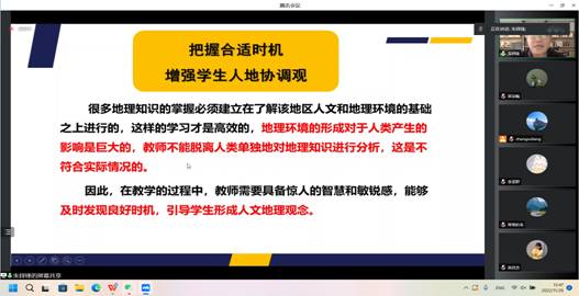 为促进学科教学地理专业硕士研究生深入了解中学地理课程教学的现状特征、教学内容,把握新时代中学地理教学的新思路和新动态,培养研究生的中学地理教学专业技能,旅游与地理科学学院于20221126日邀请山东省教科院地理教研员(高级教师)甄鸿启、青岛市西海岸新区博文中学副校长(正高级教师)胡学发、胶州市教育和体育局教研员(高级教师)朱铎锋、胶州第七中学高级教师苑文春、青岛市即墨区普东中学正高级教师邱秀玉和一级教师梁洁毓举办了2022年第2期地理名师进课堂——青岛名师专家讲座。6位地理名师通过腾讯会议线上为万象城awc体育旅游与地理科学学院硕士研究生传授中学地理教学经验。